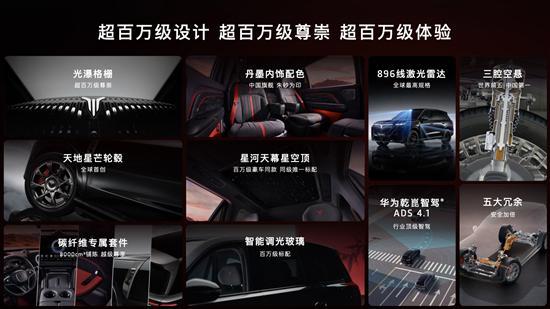 內(nèi)飾方面,新車以丹墨黑紅撞色設(shè)計為基調(diào),將東方美學(xué)、運動質(zhì)感與科技配置完美融合。儀表臺、方向盤、前排座椅背板等位置大面積使用碳纖維材質(zhì),大幅提升運動氣質(zhì)。車門與中控區(qū)域搭配流云墨韻中式飾板,將東方美學(xué)與現(xiàn)代運動風格巧妙融合,打破了傳統(tǒng)豪華內(nèi)飾的沉悶感;座椅頭枕帶有手工刺繡標識,細節(jié)處彰顯定制身份,第二排小桌板還使用紅色絨面材質(zhì)包覆,進一步提升豪華感。