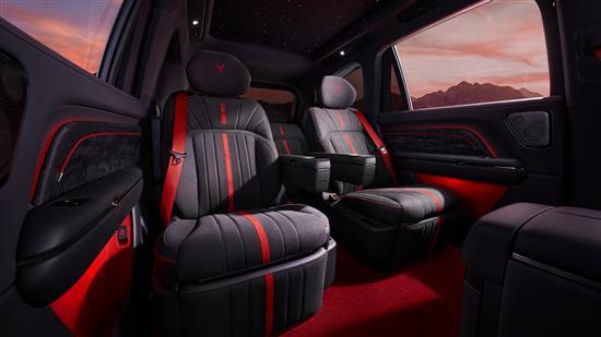 車身側(cè)面,新車采用22英寸天地星芒輪轂,搭配醒目的紅色制動卡鉗,在全黑底色中注入一抹運動亮色,視覺沖擊力拉滿。與此同時,外后視鏡裝飾罩、車窗飾條、側(cè)裙等細節(jié)均采用黑化處理。