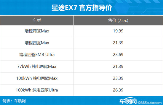 動(dòng)力方面,星途EX7提供增程和純電兩種動(dòng)力,增程版車型搭載1.5T增程器,最大功率100kW,電動(dòng)機(jī)總功率分別為227kW和377kW,總扭矩分別為332N?m和642N?m,匹配能量為41.16kWh的磷酸鐵鋰電池組,CLTC純電續(xù)航里程分別為245km和225km;純電版車型電動(dòng)機(jī)總功率分別為230kW和353kW,總扭矩分別為425N?m和663N?m,匹配能量為70.01kWh的磷酸鐵鋰電池組和100.26kWh的三元鋰電池組,對(duì)應(yīng)CLTC純電續(xù)航里程分別為600km、726km和682km。此外,新車搭載飛魚底盤3.0,配備空氣懸架以及CDC減振器,大幅提升操控性和舒適性。