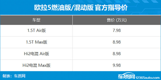 動力方面,歐拉5燃油版搭載1.5T發(fā)動機(jī),最大功率135kW,最大扭矩275N?m,傳動系統(tǒng)匹配7擋濕式雙離合變速箱;歐拉5混動版采用1.5T發(fā)動機(jī)與電動機(jī)的組合,其中發(fā)動機(jī)最大功率115kW,電動機(jī)總功率140kW,系統(tǒng)綜合功率166kW,系統(tǒng)綜合扭矩476N?m,傳動系統(tǒng)匹配2擋DHT混合動力專用變速箱。