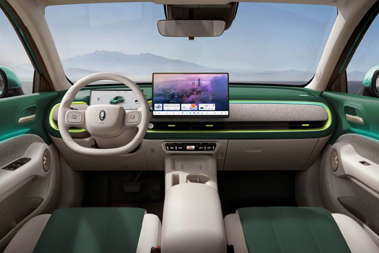 側(cè)面比例緊湊,車身線條流暢且飽滿,新車采用傳統(tǒng)機(jī)械式門把手,并配備花瓣樣式低風(fēng)阻輪轂。尾部造型相對簡潔,貫穿式尾燈隱藏于后擋風(fēng)玻璃內(nèi),科技感十足。