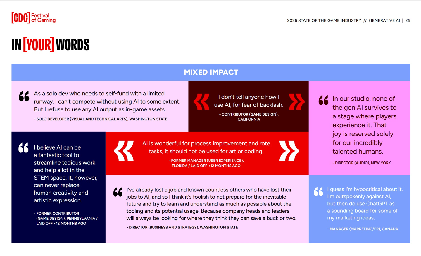 1月30日,游戲開發(fā)者大會(GDC)發(fā)布的《2026游戲行業(yè)現(xiàn)狀》調(diào)查報告顯示,超過半數(shù)的游戲開發(fā)者認(rèn)為生成式AI對游戲行業(yè)產(chǎn)生了負(fù)面影響。今年的調(diào)查涵蓋了2300多名游戲行業(yè)專業(yè)人士。結(jié)果顯示,52%的受訪者認(rèn)為生成式AI對游戲產(chǎn)業(yè)有負(fù)面影響,而在2024年,持相同觀點的開發(fā)者僅占18%,2025年則為30%。此外,認(rèn)為生成式AI對行業(yè)有益的比例從去年的13%下降至今年的7%。