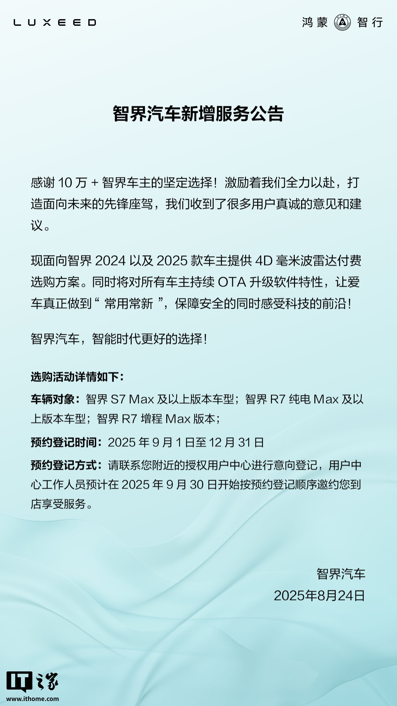 關(guān)于老款車型暫未推送升級的傳聞,智界汽車官方已明確否認(rèn)。此前有消息稱,部分舊款車型因升級4D毫米波雷達(dá)而無法進(jìn)行OTA升級,但智界產(chǎn)品總監(jiān)@智界海藍(lán)天已發(fā)文澄清,指出這一信息不屬實(shí)。去年,智界已開放4D毫米波雷達(dá)的付費(fèi)選購方案,并宣布用戶中心即可進(jìn)行雷達(dá)更換,無需車輛返廠。