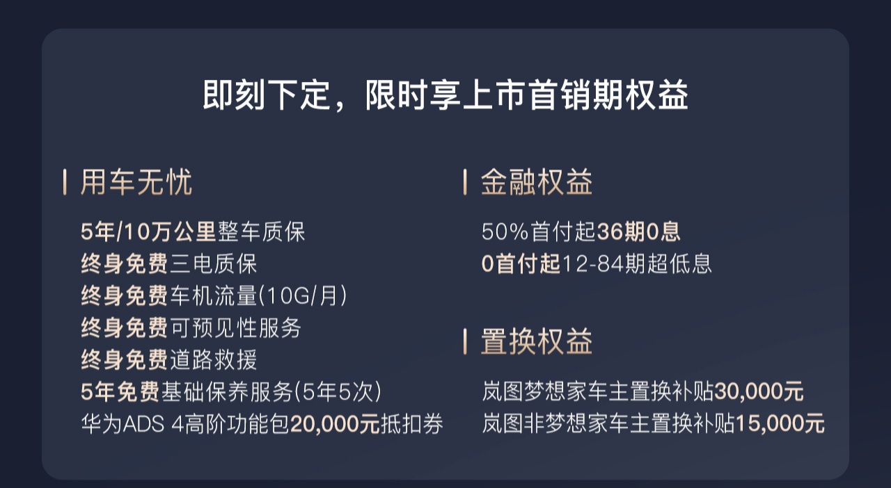 今日,嵐圖夢想家冠軍版正式上市,官方指導價為30.99萬元。同時,嵐圖夢想家第20萬輛車在武漢黃金工廠下線。新車采用曜黑格柵設計,與玄英黑車身配色相呼應,強化了整車氣場與力量感。官方提供多項購車權(quán)益,包括華為ADS4高階功能包20000元抵扣券、5年/10萬公里整車質(zhì)保、終身免費三電質(zhì)保等。此外,嵐圖夢想家冠軍版搭載華為乾崑智駕ADS4系統(tǒng)及鴻蒙座艙5,擁有192線激光雷達,具備250m超遠探測距離和30cm小目標物的識別能力。車內(nèi)配備SPA級懸浮重力座椅、13升雙門智能冷暖箱以及17.3英寸3K后排娛樂屏,提供多設備互聯(lián)娛樂體驗。動力方面,新車搭載插混系統(tǒng),CLTC純電續(xù)航235km,綜合續(xù)航1411km。