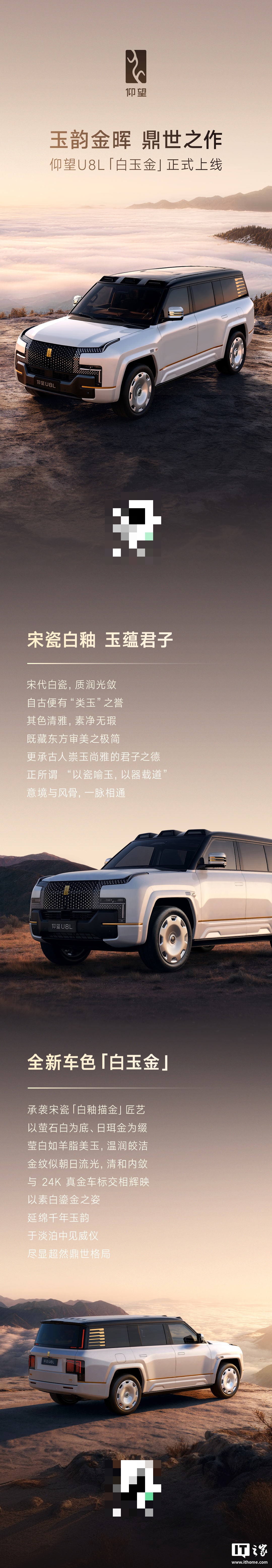 今日,比亞迪旗下高端品牌仰望汽車宣布,仰望U8L新推出「白玉金」車色。該配色靈感來(lái)源于宋瓷「白釉描金」的匠藝,以螢石白為底色,搭配日珥金作為點(diǎn)綴,并特別采用了24K真金車標(biāo)設(shè)計(jì),展現(xiàn)出獨(dú)特的奢華感。