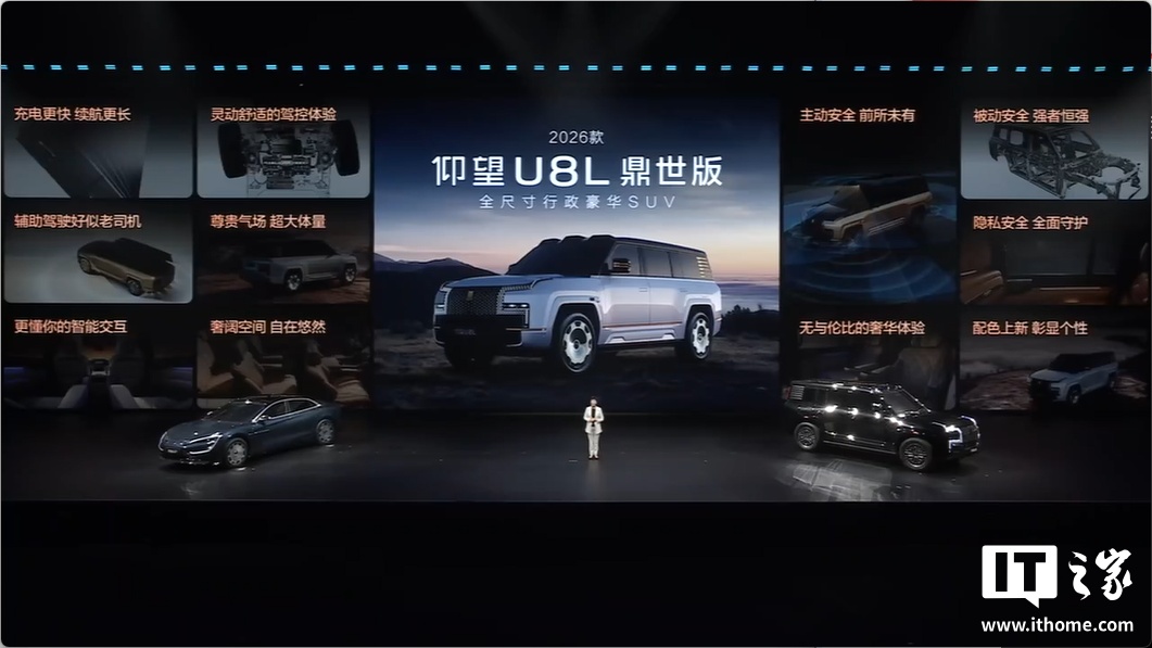 電池暨閃充技術(shù)發(fā)布會(huì)上,比亞迪推出了2026款仰望U7、U8和U8L鼎世版車型。這些新車型均搭載了第二代刀片電池及閃充技術(shù),其中仰望U8L2026款在續(xù)航能力上有所提升,并新增了閃充技術(shù)。此外,新車還提供了三大安全升級(jí),包括應(yīng)急浮水緊急自動(dòng)激活、NOA爆胎穩(wěn)行穩(wěn)停、全場(chǎng)景隱私安全。這些安全功能后續(xù)也能通過(guò)OTA更新為老款車型提供。仰望U8L2026款的起售價(jià)為130萬(wàn)元。