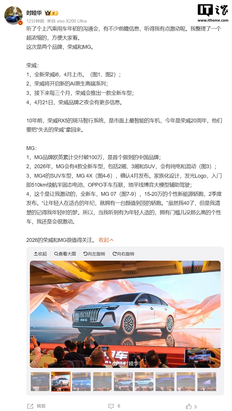 混合動力版本,預(yù)計售價區(qū)間為15-20萬元,并計劃于今年四月上市。MG品牌還透露,2026年將推出4款全新車型,包括兩廂、三廂轎車和SUV,涵蓋純電和混動車型。