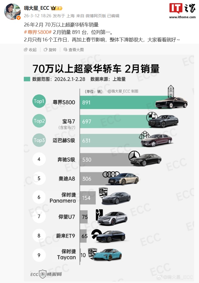 今日,ECC情報(bào)局博主@嗨大星_ECC分享了2月70萬以上超豪華轎車的銷量數(shù)據(jù)。在該細(xì)分市場中,鴻蒙智行尊界S800以891臺(tái)的銷量繼續(xù)領(lǐng)跑,盡管2月僅有16個(gè)工作日且受春節(jié)影響,整體銷量有所下滑。尊界S800新版本搭載華為乾崑896線激光雷達(dá),建議零售價(jià)72.8萬元起。3月4日,華為常務(wù)董事余承東宣布,尊界S800連續(xù)5個(gè)月穩(wěn)居百萬豪車銷量冠軍,2025年9月至2026年1月累計(jì)上險(xiǎn)量13092輛,超越保時(shí)捷Panamera、奔馳邁巴赫、奔馳S級。