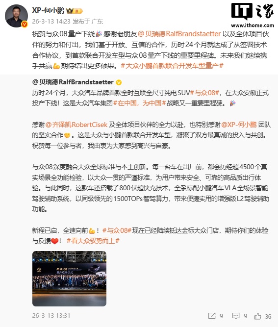今日,大眾汽車與小鵬汽車聯(lián)合開發(fā)的首款車型“與眾08”在大眾安徽正式量產(chǎn)下線。這款全時互聯(lián)全尺寸純電SUV從技術(shù)合作協(xié)議簽署到投產(chǎn)僅用時24個月。作為大眾汽車集團(tuán)“在中國,為中國”戰(zhàn)略的重要成果,“與眾08”融合了本土技術(shù)生態(tài),搭載800伏高壓超快充平臺,全系標(biāo)配小鵬汽車VLA全場景智能駕駛輔助系統(tǒng),搭載高通8295P芯片,擁有1500TOPs智駕算力,采用