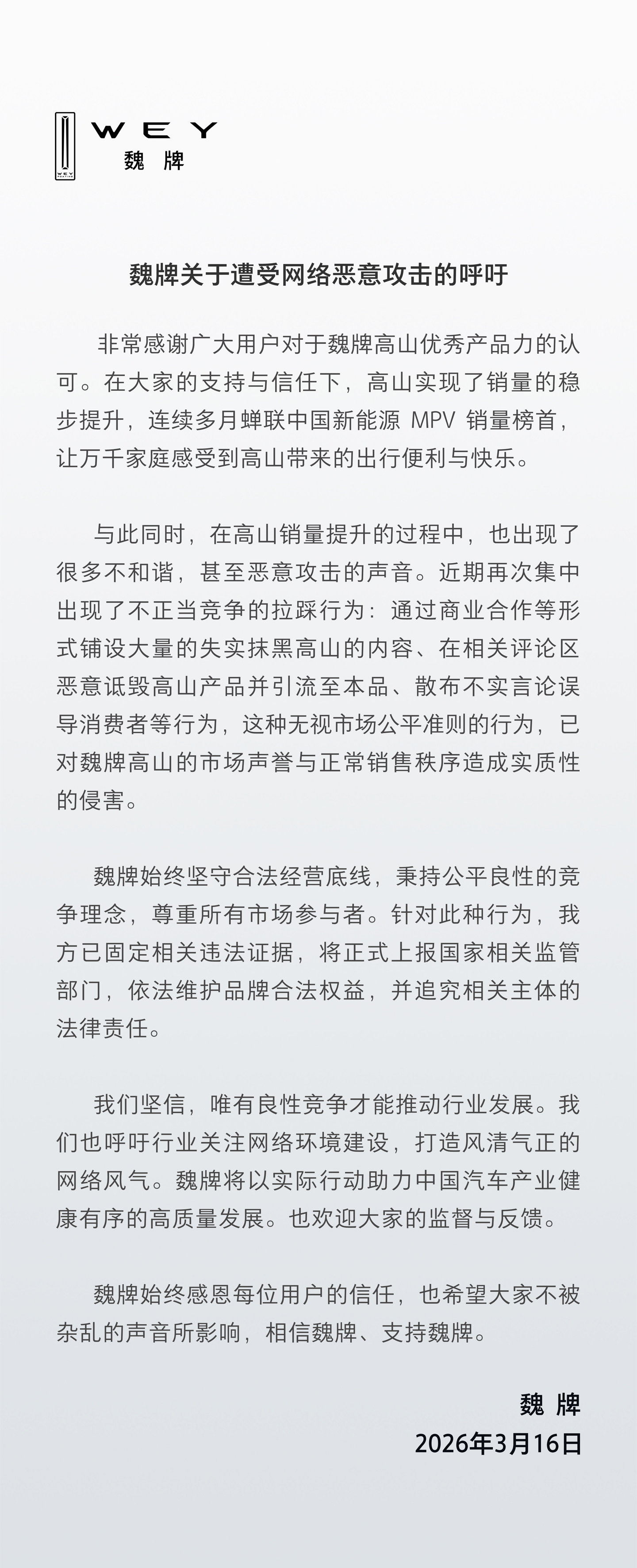 3月16日,長城汽車魏牌官方微博發(fā)布聲明,指出在旗下新能源MPV車型高山銷量穩(wěn)步提升的同時,遭遇了不和諧聲音和惡意攻擊。聲明中提到,近期出現(xiàn)了不正當(dāng)競爭行為,包括通過商業(yè)合作散布失實內(nèi)容、惡意詆毀高山產(chǎn)品以及散布不實言論誤導(dǎo)消費者等。這些行為已對魏牌的市場聲譽和銷售秩序造成實質(zhì)性侵害。