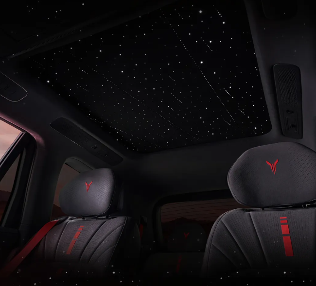 3月13日,嵐圖汽車公布了泰山黑武士車型的內(nèi)飾設計,并宣布該車型將于3月17日正式上市。泰山黑武士車型內(nèi)飾采用丹墨配色,以“玄墨”為主色調(diào),僅在座椅縫線、頭枕等關鍵部位保留“丹砂”點紅,展現(xiàn)出獨特的東方美學。車內(nèi)配備了星河天幕星空頂,擁有598顆燈珠,提供三種模式,營造豪華氛圍。