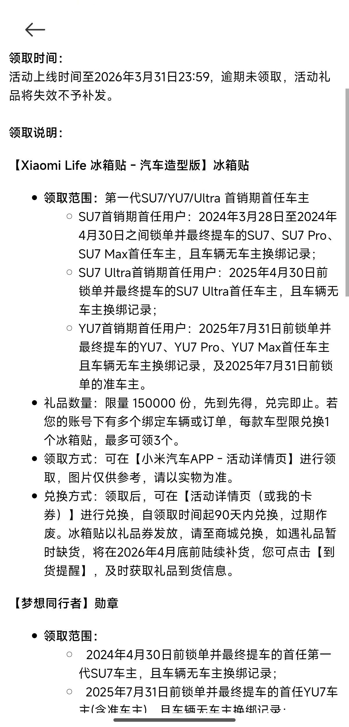 3月17日,小米汽車為慶祝上市2周年,向第一代SU7/YU7/Ultra首銷期首任車主贈(zèng)送定制冰箱貼。該冰箱貼以汽車造型設(shè)計(jì),采用卡布里藍(lán)配色,定價(jià)19.9元,限量15萬份。每位車主最多可兌換3個(gè)冰箱貼,若賬號(hào)下有多個(gè)綁定車輛或訂單,每款車型限兌換1個(gè)。此外,小米汽車還為車主點(diǎn)亮了一枚紀(jì)念勛章。