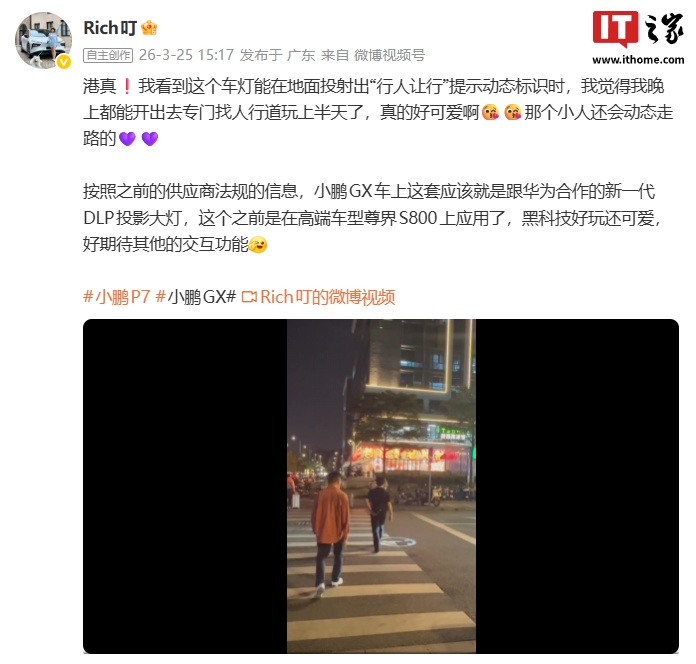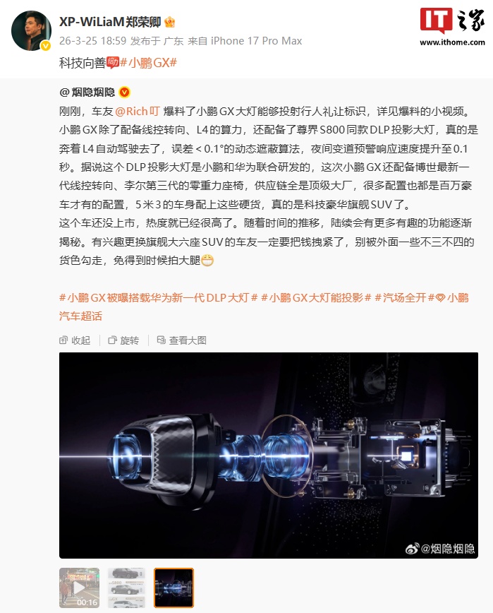 3月25日,博主@Rich叮發(fā)布視頻透露小鵬GX車燈支持在地面投射出禮讓行人的動態(tài)標(biāo)識,這一功能得到了小鵬汽車平臺產(chǎn)品營銷總監(jiān)@XP-WiLiaM鄭榮卿的確認(rèn)。小鵬GX的車燈是與華為合作的新一代DLP投影大燈。小鵬GX已登上《免征車輛購置稅的新能源汽車車型目錄》(第二十八批),提供增程版與純電版兩種動力形式。純電版最高續(xù)航750km,增程版純電續(xù)航320km。小鵬GX增程版與純電版采用統(tǒng)一的設(shè)計語言,延續(xù)新勢力品牌標(biāo)志性的極簡風(fēng)格,整體造型硬朗大氣。車身比例方面,新車采用長軸距、長后懸布局,并配合懸浮式車頂設(shè)計。車頭與尾部均配備三段式貫穿式燈組,前臉采用分體式大燈布局,前包圍集成主動進(jìn)氣格柵。車身尺寸方面,小鵬GX長寬高分別為5265/1999/1800mm,軸距達(dá)到3115mm,定位大型6座SUV。功能性設(shè)計上,新車配備天地門式尾門結(jié)構(gòu)與全景天幕。小鵬GX將全球量產(chǎn)首發(fā)博世新一代線控轉(zhuǎn)向系統(tǒng),該系統(tǒng)原生適配L4級