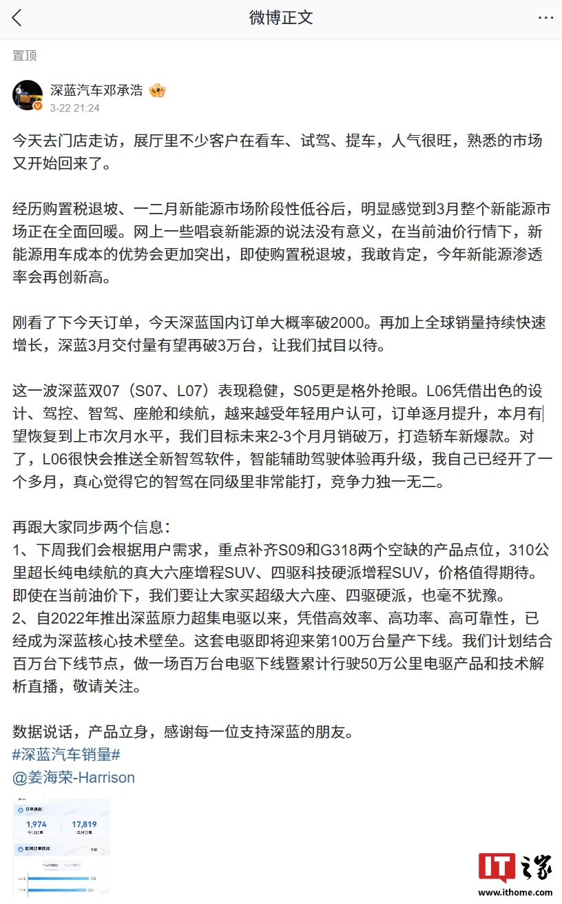 深藍(lán)汽車董事長(zhǎng)鄧承浩在3月23日通過社交媒體發(fā)文,對(duì)當(dāng)前汽車市場(chǎng)人氣回升的趨勢(shì)表示樂觀。他指出,在經(jīng)歷購(gòu)置稅退坡和新能源市場(chǎng)階段性低谷后,3月份新能源市場(chǎng)正在全面回暖。鄧承浩強(qiáng)調(diào),盡管有唱衰新能源的聲音,但在當(dāng)前油價(jià)行情下,新能源用車成本的優(yōu)勢(shì)將更加明顯,預(yù)計(jì)即使購(gòu)置稅退坡,今年新能源滲透率也將再創(chuàng)新高。
