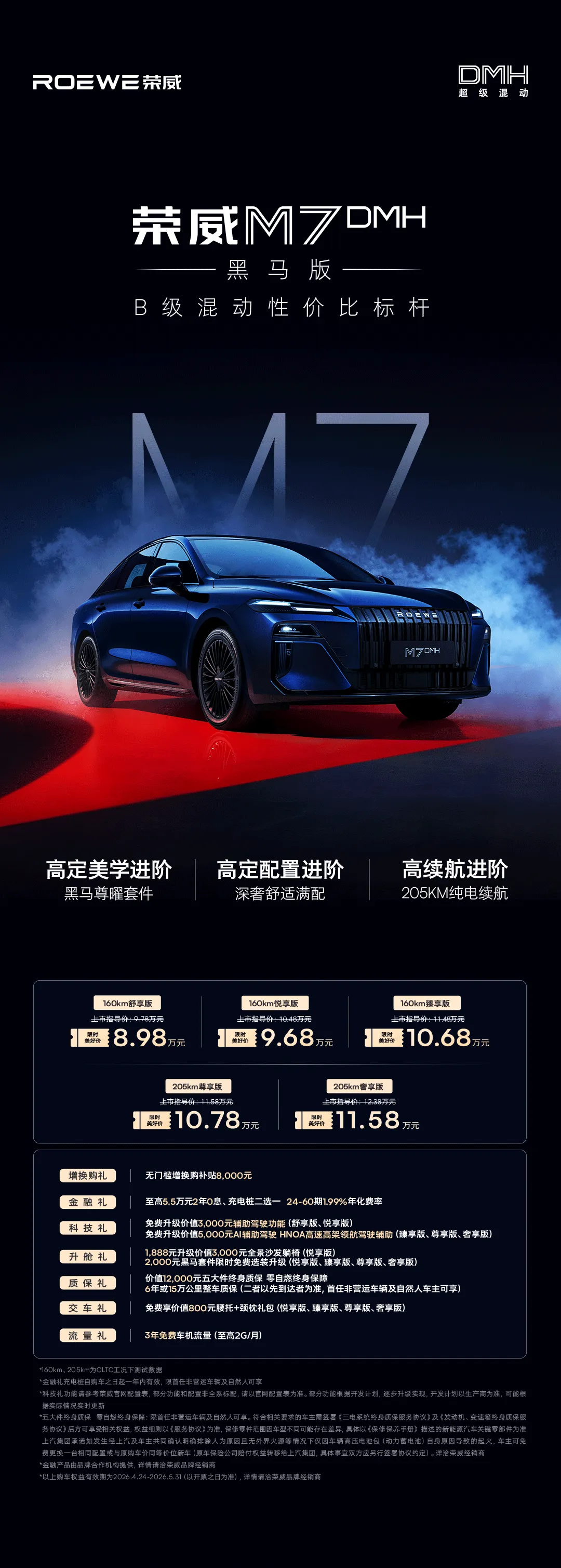 4月24日,北京國際車展上,上汽集團宣布榮威M7黑馬版正式上市,限時起售價為8.98萬元。新車采用八層高階立體工藝專屬定制藍黑色車漆,車頭為直瀑式前臉設(shè)計,車身線條硬朗流暢,搭配熏黑窗線飾條和熏黑側(cè)裙,提供18寸多輻熏黑輪轂。榮威M7黑馬版預(yù)計將延續(xù)現(xiàn)款在售M7規(guī)格,現(xiàn)款DMH車型車身尺寸為4940/1890/1510毫米,軸距2820毫米。