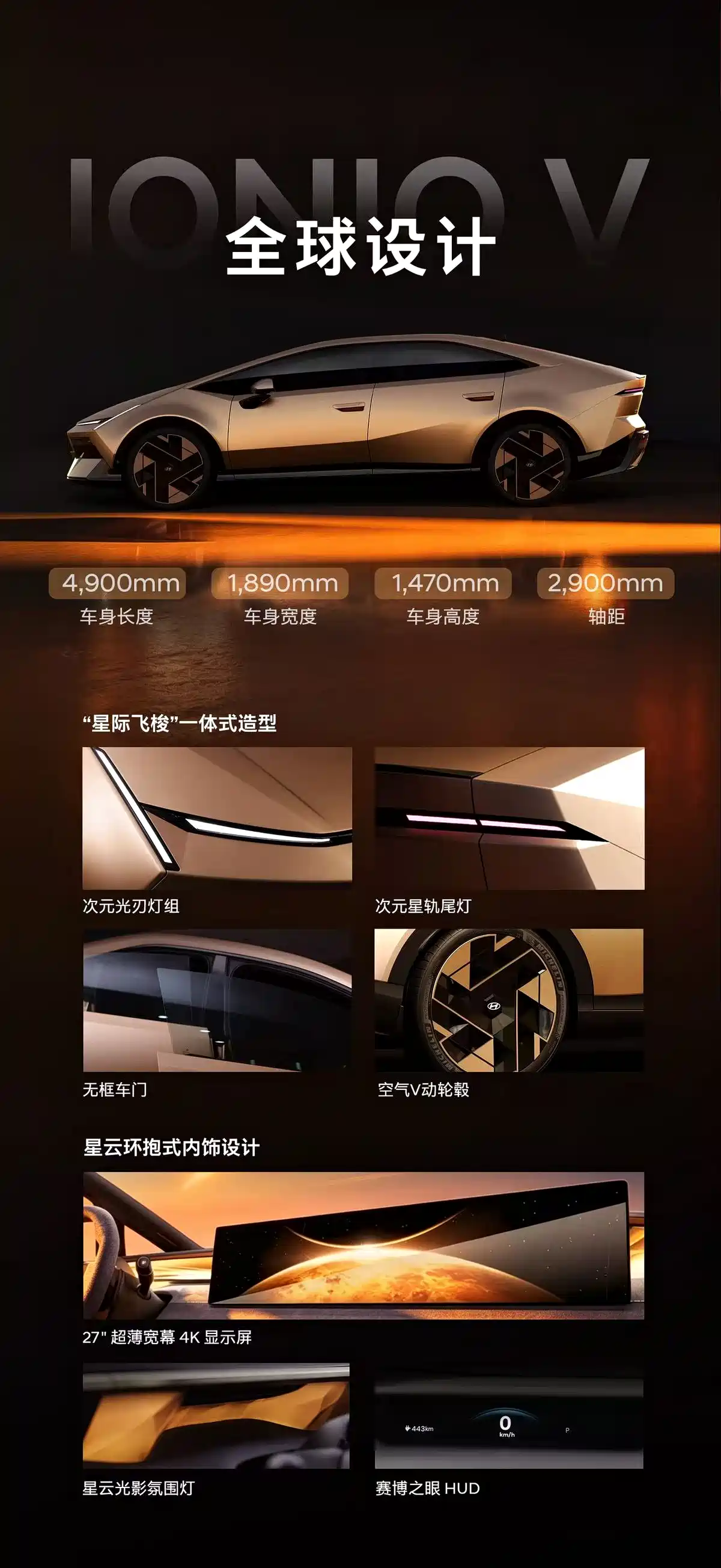 寧德時代、文心大模型、火山引擎等技術(shù)。車身尺寸為4900/1890/1470mm,軸距2900mm,車尾采用次元星軌尾燈樣式。車內(nèi)配備星云環(huán)抱式內(nèi)飾設(shè)計,27英寸超薄4K超大屏,星云光影氛圍燈,賽博之眼HUD,展現(xiàn)了IONIQ品牌對未來汽車的設(shè)想。