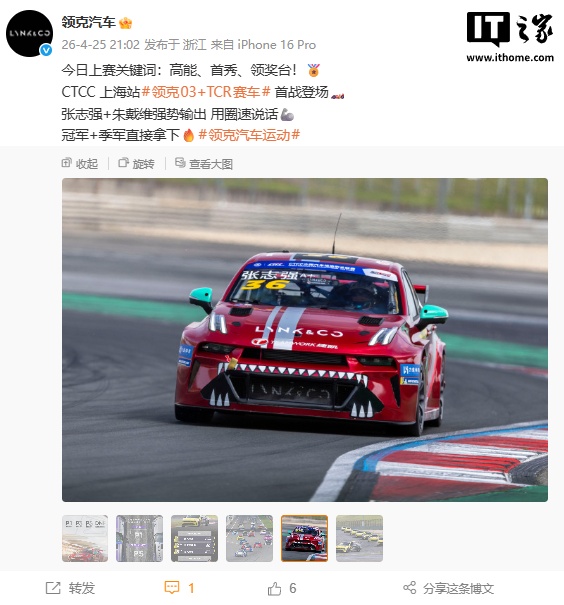 4月25日,領(lǐng)克汽車在2026賽季CTCC中國汽車場地職業(yè)聯(lián)賽揭幕戰(zhàn)中取得顯著成績,全新領(lǐng)克03+TCR賽車首次亮相國家級賽場并成功登頂領(lǐng)獎臺。領(lǐng)克捷凱車隊車手張志強(qiáng)獲得第一回合決賽冠軍,隊友朱戴維獲得季軍,同時領(lǐng)克03+TCR賽車榮獲車型杯冠軍。此次賽事在上海國際賽車場舉行,包括TCR冠軍聯(lián)賽上海大獎賽、CTCC中國杯等多項賽事。