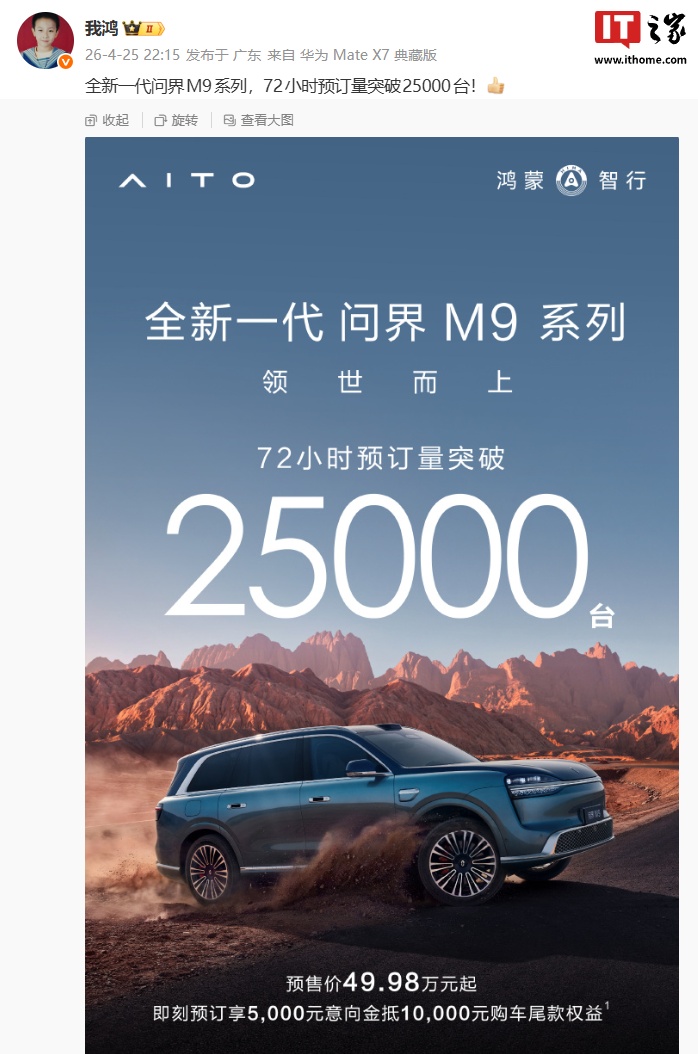 4月26日,華為常務(wù)董事余承東透露,全新一代問界M9系列汽車自發(fā)布以來72小時內(nèi)預(yù)訂量突破25000臺,預(yù)售價49.98萬元起。問界M9系列被描述為搭載超過140項創(chuàng)新技術(shù)的全新重構(gòu)車型,而非簡單升級,更多驚喜將陸續(xù)公布。