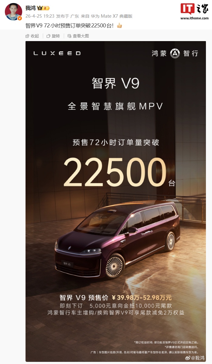 華為常務(wù)董事余承東透露,華為終端BG首席執(zhí)行官何剛在發(fā)布會(huì)結(jié)束后立即下單購買智界V9。何剛本人也曬出了自己的訂單,并表示對智界V9的二排迎賓座椅、百變空間和超大后備箱設(shè)計(jì)非常滿意。這些特點(diǎn)無疑增加了智界V9的市場吸引力,使其在短時(shí)間內(nèi)獲得大量訂單。