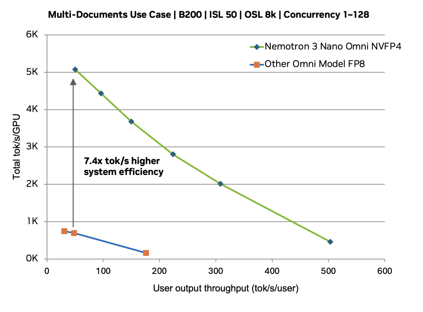Nemotron3NanoOmni基于30B?A3B混合專家(MoE)架構(gòu),能夠根據(jù)任務(wù)和模態(tài)進(jìn)行激活,實(shí)現(xiàn)高吞吐量與可擴(kuò)展的多模態(tài)性能。在多個(gè)行業(yè)基準(zhǔn)測試中,該模型展現(xiàn)了優(yōu)異的性能,包括文檔智能榜單和視頻與音頻理解基準(zhǔn)。MediaPerf基準(zhǔn)測試顯示,Nemotron3NanoOmni在所有任務(wù)上實(shí)現(xiàn)了最高吞吐量,且視頻級標(biāo)注的推理成本最低。此外,該模型在BlackwellGPU上采用NVFP4量化時(shí),在處理復(fù)雜文檔、長時(shí)推理和大批量視頻的企業(yè)級工作負(fù)載中,吞吐量領(lǐng)先于其他開放式全模態(tài)模型。